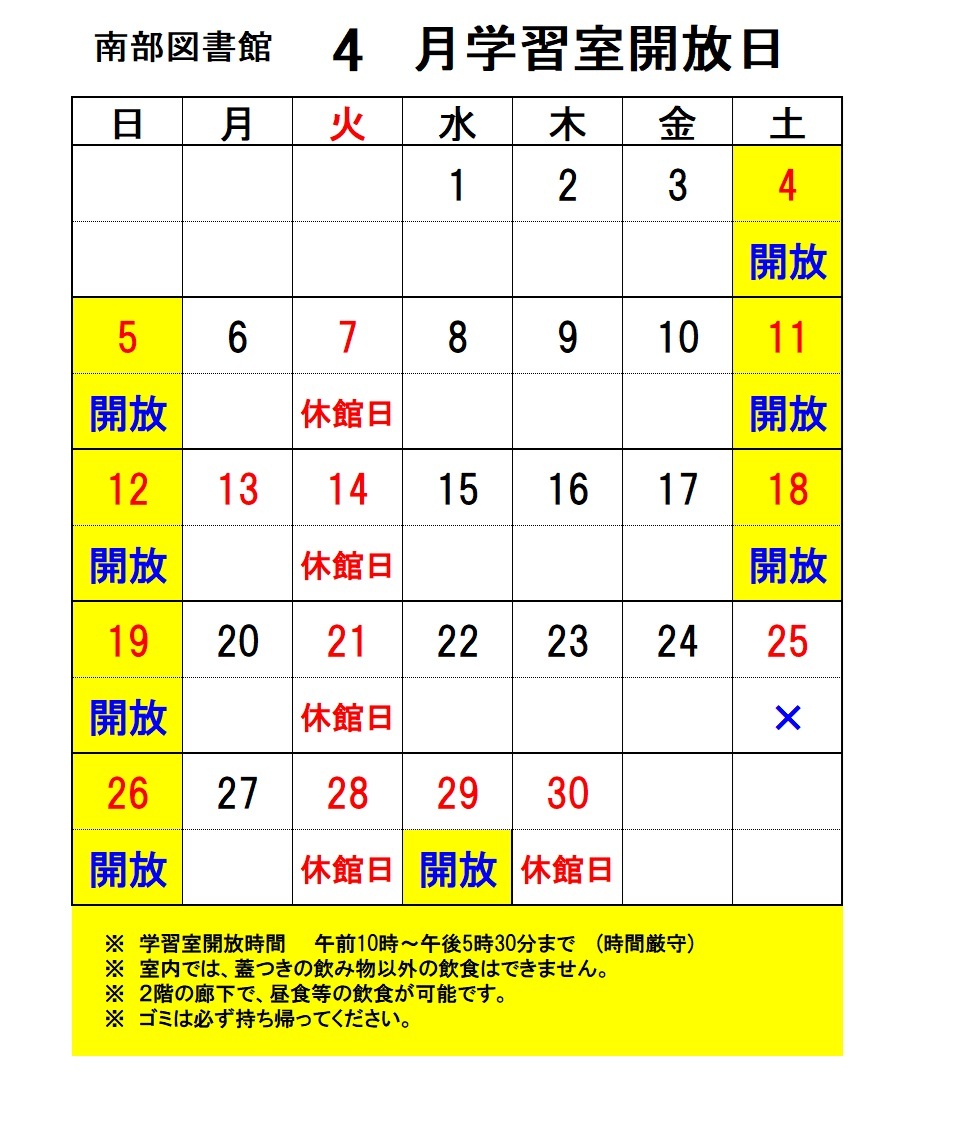 南部図書館 4月の学習室開放日